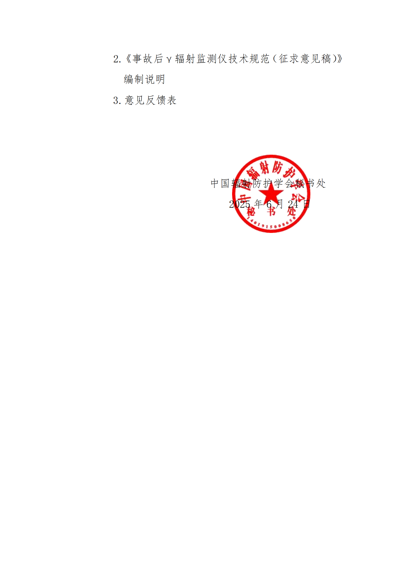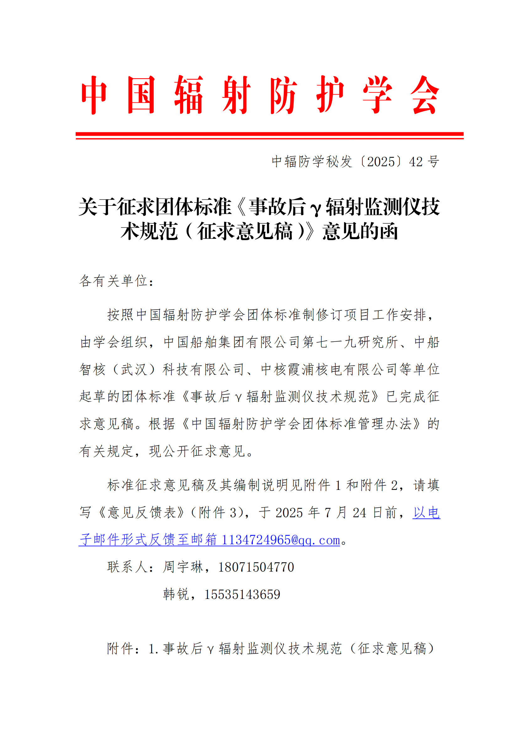 关于征求团体标准《事故后γ辐射监测仪技术规范(征求意见稿)》意见的函