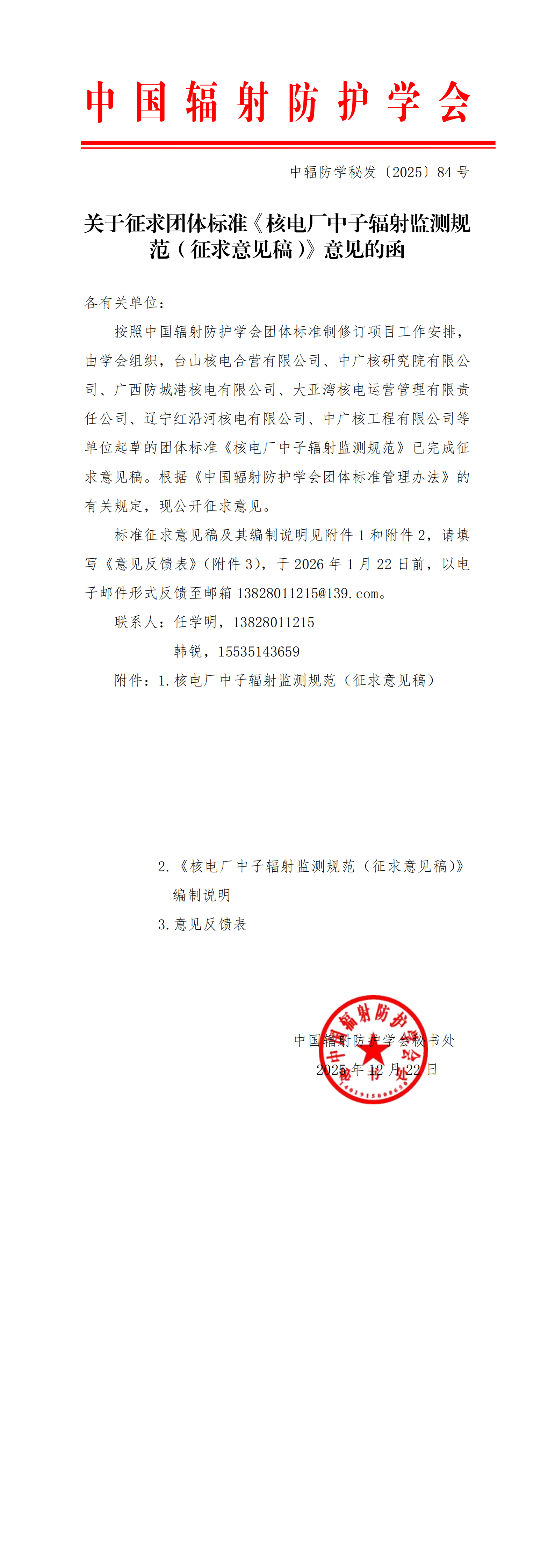关于征求团体标准《核电厂中子辐射监测规范(征求意见稿)》意见的函